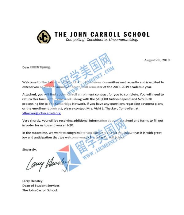 恭喜陈同学补录约翰卡洛尔学校 The John Carroll School