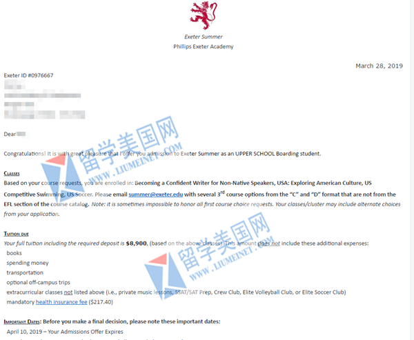 恭喜留学美国网L同学获得Phillips Exeter Academy夏校offer