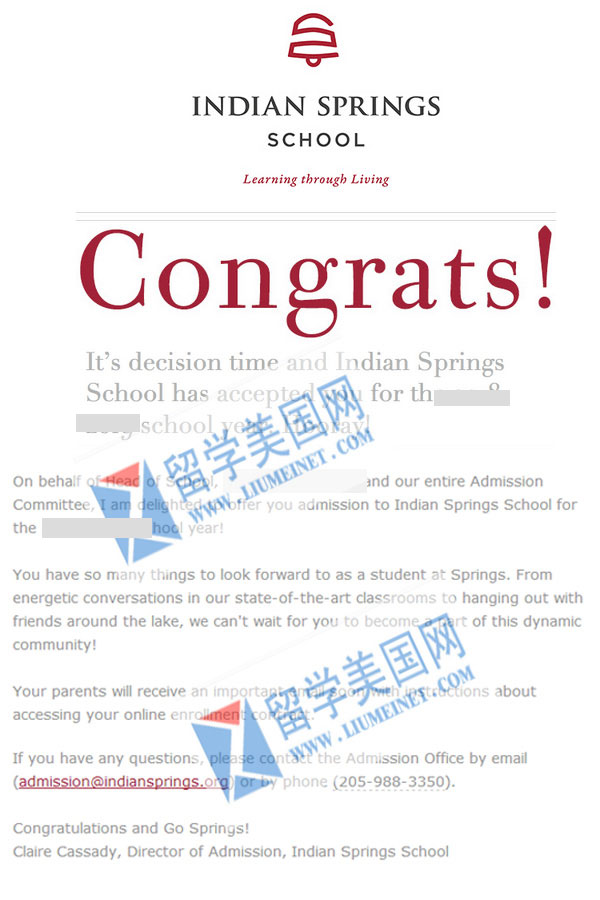 恭喜留美网J同学成功拿到顶尖寄宿学校印第安泉中学(India Springs School )offer,学生和家长都比较急,当时所有顶尖寄宿都没名额了,但是留美网经过不懈的努力和付出,最终与印第安泉中学招生官取得了联系,并且为学生争取了一个名额,最终安排上面试,三天内拿到录取,还是很幸运的。