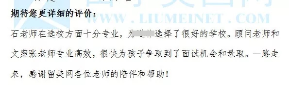 2019年已经接近尾声,但是美国高中招生春季、秋季招生却在火热进行中,每当看到每一位从留学美国网送出的学生都收获了自己心仪学校的录取,我们都感到非常的骄傲自豪。在今天这个特别的日子里,留美网非常感恩,也非常感谢每一位家长的信任、理解和配合,同时感谢每一位可爱而优秀的学生们,你们的满意才是我们值得荣耀和骄傲的事情。 带着你们的信任,我们未来将会不断的完善我们的专业、我们的服务,为更多的家庭、更多的孩子申请到理想的学校,成就孩子的美好未来! 在服务家庭、学生的时候我们经常会得到很多的反馈,而这些反馈则是我们通往成功途中一道靓丽的风景线,下面就让我们一起来倾听吧。