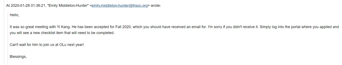 恭喜留美网康同学被橘郡路德中学录取!