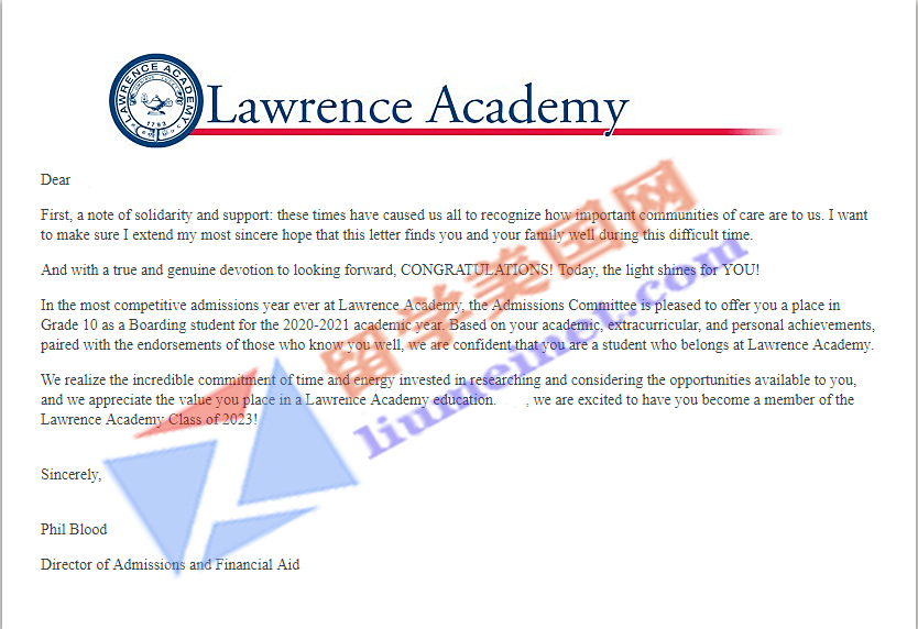 大家好!留美网再传录取捷报!在石老师带领下,经过留美网团队的共同努力,在学生没有标化成绩的情况下成功帮助L同学拿到劳伦斯中学(Lawrence Academy)的录取,Lawrence Academy石老师每年都会定期去考察该校,学校老师们非常友好,体育非常强。恭喜留美网L同学!请见录取offer展示!每一个Offer的背后都凝聚了留美网所有同事的共同努力,再次祝贺L同学!希望她在美国学业有成!同时感谢家长的配合和信任~
