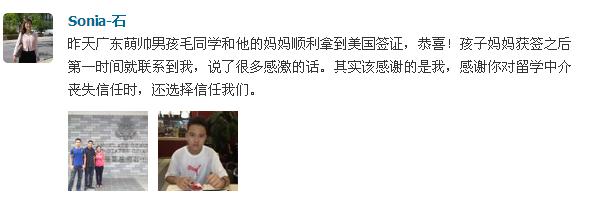 给该同学做申请的过程算是我们所做申请里感觉比较复杂的一个。这位同学早在两年前就开始申请,可是不幸遇到了非正规中介,两年时间无任何进展,却耗费了学生家长不少的时间和金钱成本。家长本来已经对中介极其反感,不再信任。但是经过我们不懈的努力,她的心终于阴转晴。后来一切按部就班准备,该同学和他的家长也都很积极的配合我们。后来在面试培训的时候我才更深入的了解他的个性。自信,幽默又调皮,就像一个招人喜欢的小猴子。整体上来说,他还是很配合的。不过他比较懒,对于我所整理好的材料,他总是说怎么这么多呀。又或者在培训的时候,偷吃一根薯条(因为当时赶时间,他还没吃午饭)。这让我哭笑不得。所以我只能来软的,对他循循善诱,一边夸奖,一边鞭策。最后,他没有辜负我的苦心,阿拉玛尼高中面试完当场就对他说欢迎来我们学校就读。他自己也开心的把这个好消息发表到自己的说说里。这个录取过程仅仅用了2周时间。不管是什么样的学生,都是家人的期望,祖国的未来。江山如此多娇,说的不就是我们这些可爱的申请人吗!衷心地祝愿他们在外求学之路越走越宽广!留美美国网至今已是硕果累累,桃李满天下!希望我们将来能帮助到越来越多的人实现他们的梦想。