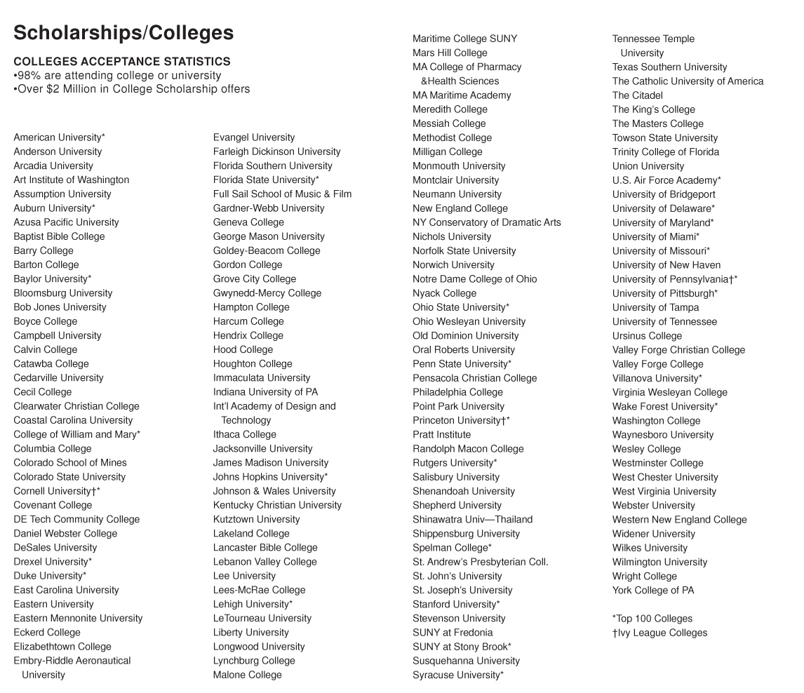 学校近几年的毕业去向:普林斯顿大学、宾夕法尼亚大学、康奈尔大学、杜克大学、俄亥俄州立大学、维克森林大学、约翰霍普金斯大学、美国大学、宾州州立大学、罗格斯大学、纽约州立大学、贝勒大学、马里兰大学和德雷克赛尔大学。全部名单如下: