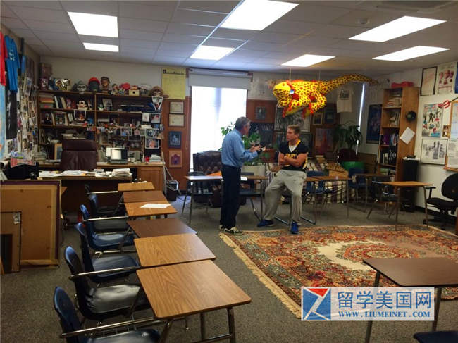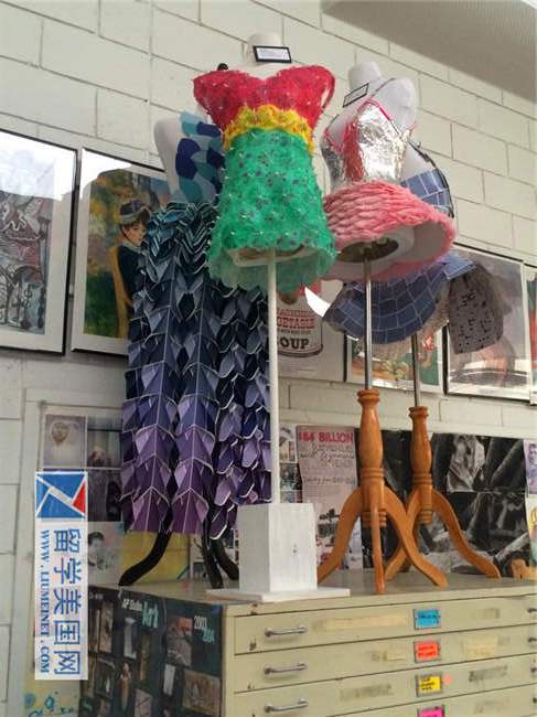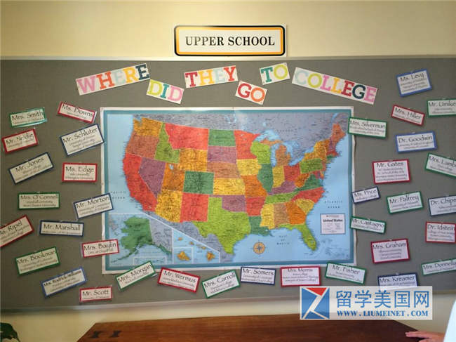 每去一所高中,石老师都会放慢脚步欣赏墙壁上的壁报。在美国大部分的私立高中,这些壁报都是鲜活而充满趣味的,大多是手工剪辑粘贴的创意”作品“,或者是学生们自己的绘画作品,而不是冷冰冰的印刷品。上图是塔特龙高中的毕业去向图表。