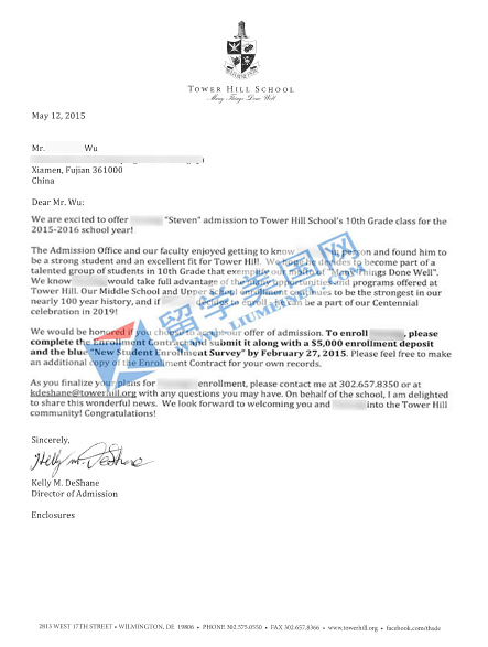 恭喜吴同学获走读前50塔山高中Tower Hill School 录取!