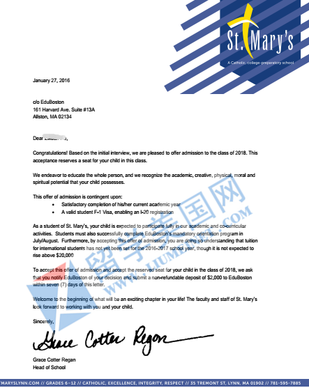 恭喜H同学获得波士顿优质中学圣玛丽预备中学录取!