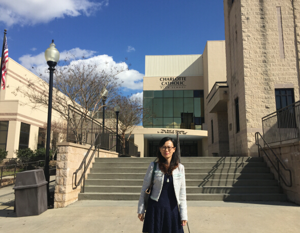 Charlotte Catholic high school是一所位于北卡夏洛特一所较大的天主教学校,学校学术非常严谨,在校生近1400人,提供9-12年级的教育。这次负责一直陪同接待的Maryangle Morgan顾问老师非常热情,她曾来访过中国,曾去过北京、青岛、南京等城市,她说她非常喜欢中国。