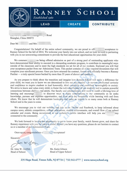 恭喜Y同学获东部 兰尼学校Ranney School录取!