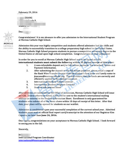 恭喜张同学获加州蓝带莫若中学录取!3月7日学校校长来华哦!