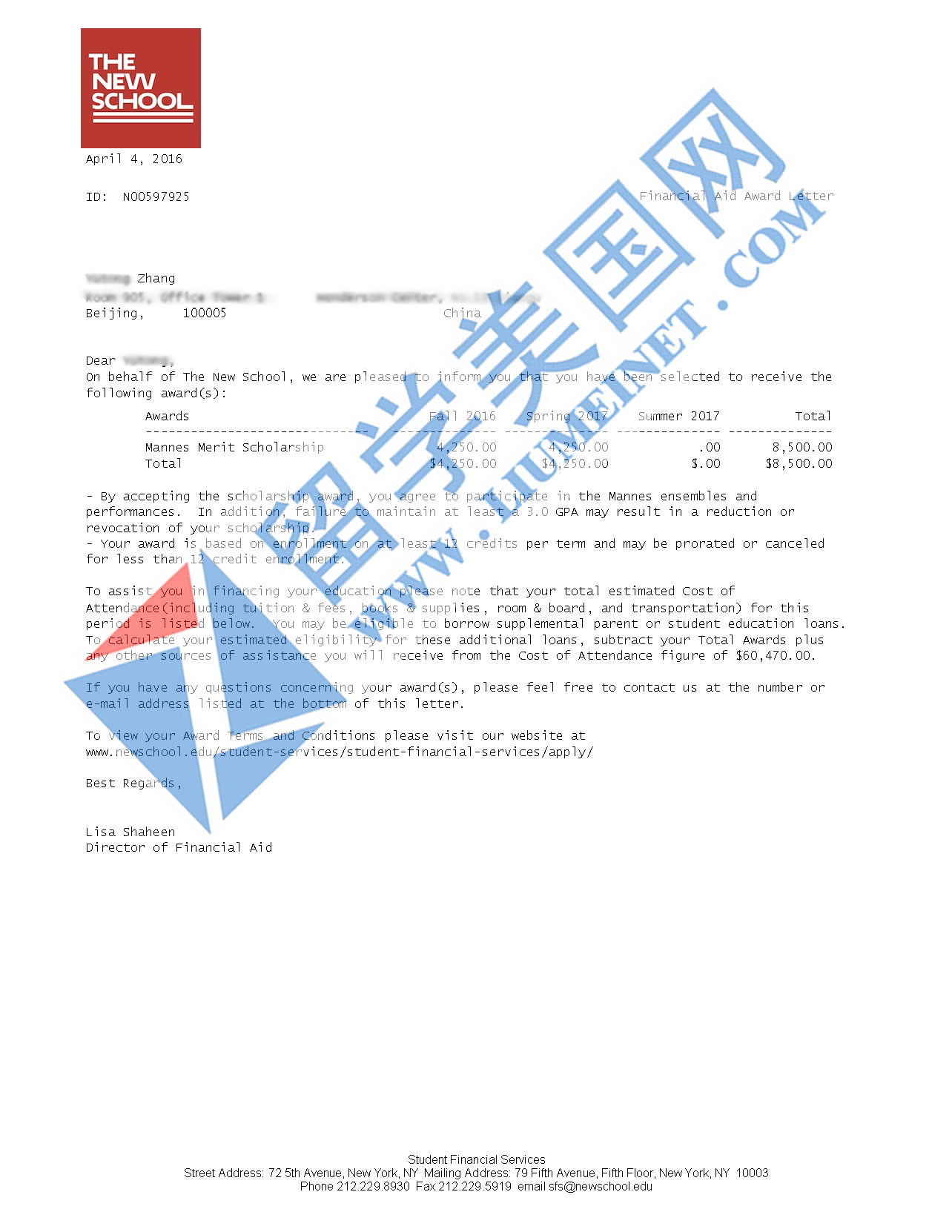恭喜留美ZYT同学被美国Mannes College of Music录取并获奖学金
