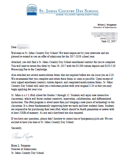 好消息:恭喜L同学成功补录到St.Johns Country Day School !在补录白热化的阶段,还能帮孩子申请到理想的院校!一周拿到offer!真的太感谢留美网团队了!留美网用事实、效率证明了我们的专业度!可信度!希望每个孩子都在美国有一个美好的前途!留美网全体员工为之努力付出是值得的!祝L同学在美国展翅高飞!前途似锦!目前留美网还有很多顶尖高中的名额,想申请的家长可以拨打电话400-000-7805!微信:liumeinet2014
