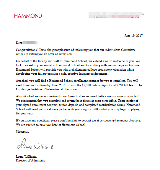 好消息:恭喜李同学成功补录到顶尖高中Hammond School!在补录白热化阶段,留美网一周拿到offer!成功帮助李同学申请到理想学校!该校很顶尖,申请难度很大;留美网老师通过漂亮的文书展示,深刻的亮点挖掘,及时与招生办展开沟通与跟进!步步紧跟,最终选择到了理想的学校,展现了留美网在补录阶段的超强能力!超强人脉!