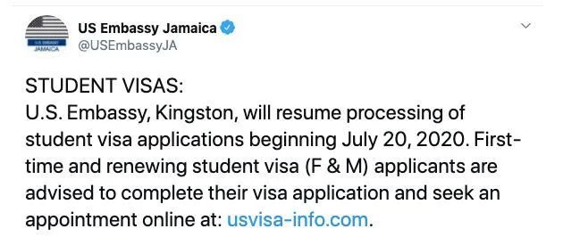 美国驻牙买加大使馆官宣:7月20日开始重启学生签证业务!