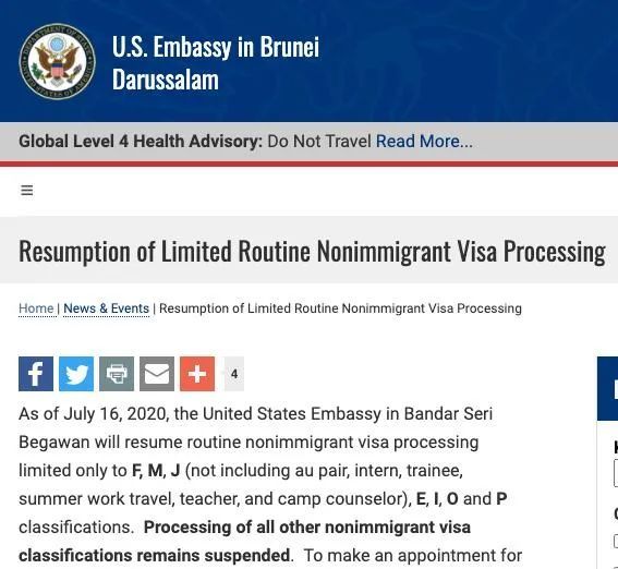 美国驻文莱大使馆上周正式宣布:从7月16日起恢复F、M、J类等签证申请业务。