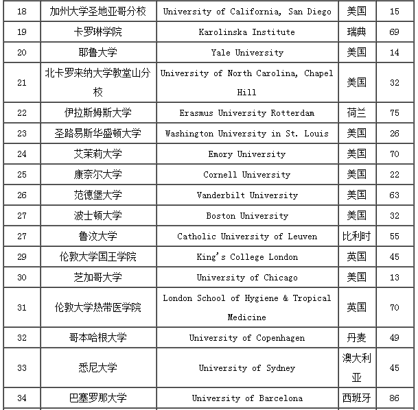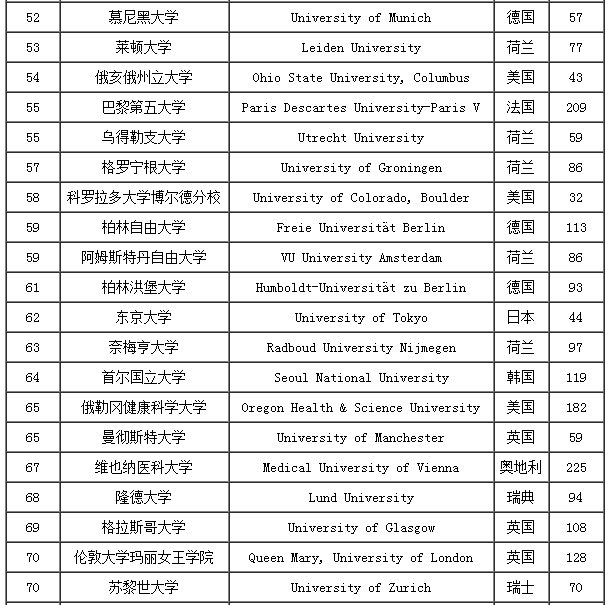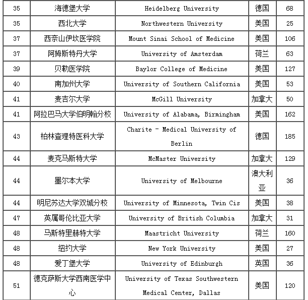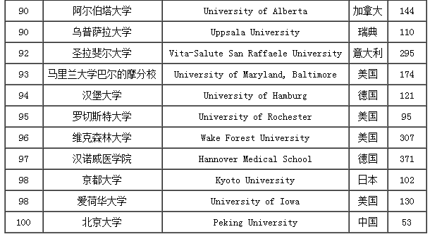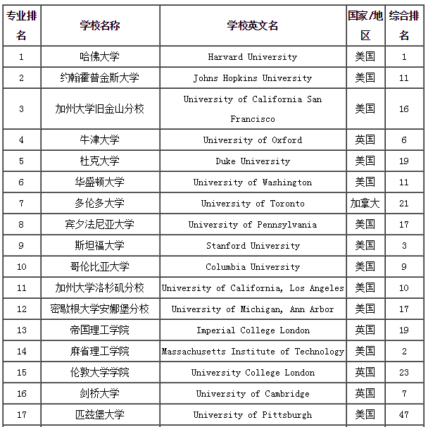 2017USNEWS临床医学专业世界大学排名TOP100