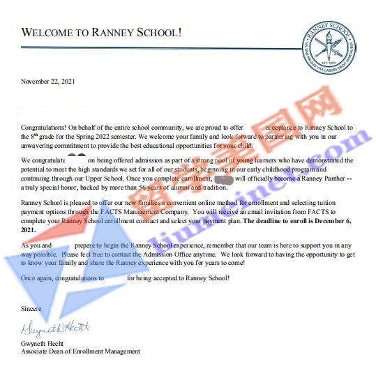 录取院校:兰尼中学Ranney School
