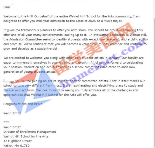 录取学校:核桃山艺术高中Walnut Hill School for the Arts