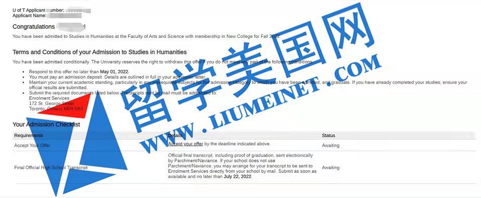录取捷报!恭喜留美网Y同学录取到多伦多大学University of Toronto~