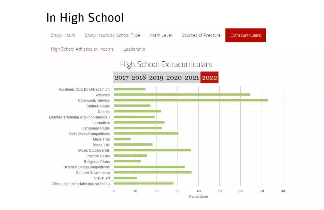 根据2022届的哈佛大学新生档案我们不难发现,哈佛新生很重视参与课外活动,他们课外活动的类型非常丰富。