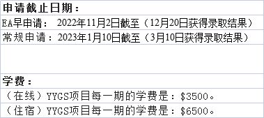 是全球最具多样性的、每一期两周时长的暑期学术项目之一,适合的学生16周岁以上的中学生。YYGS为来自150多个国家的2000多名学生提供服务,为国内外的学生提供超过300万美元的助学金。