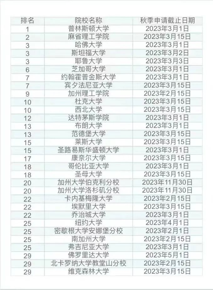 美国TOP30转学申请截止时间