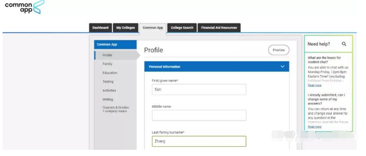 Common App是主表格,是所有申请学校都会看到的共享信息,共包括7项:Profile、Family、Education、Testing、Activities、Writing;以及各学校有各自规定的Courses & Grades。
