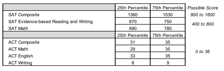 录取者中排名后25%的学生SAT成绩则在1360分,ACT成绩31分。