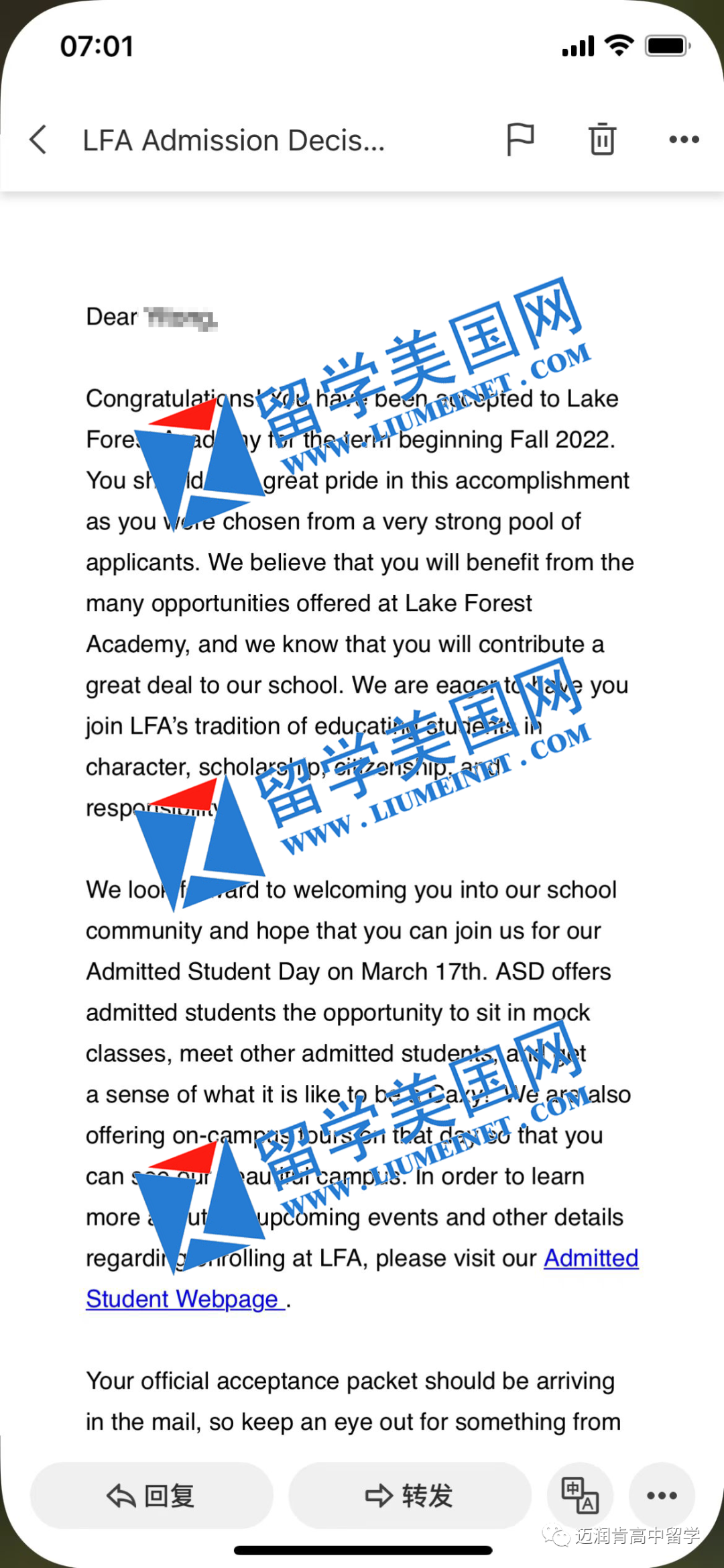 留美网学生湖森中学录取offer展示
