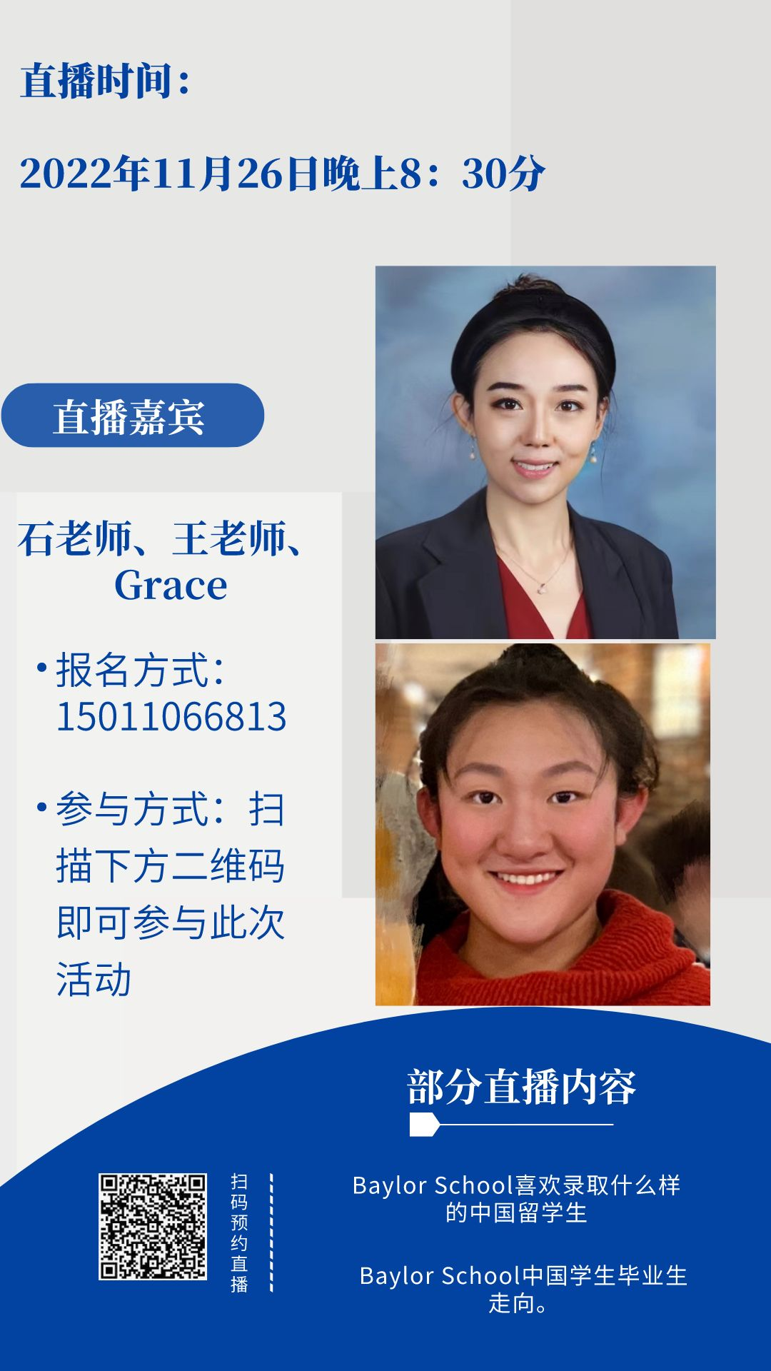 此次的分享干货满满,可以让你全方位的了解贝勒中学Baylor School!锁定11月26日晚上8点30分的直播,让我们一起来听听这场盛大的直播盛宴吧。
