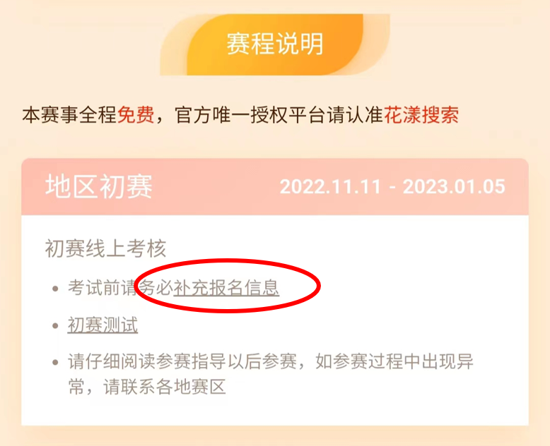 如上图所示:在大赛首页中找到“地区初赛”,点击“补充报名信息”后,按照指示逐项如实填写参赛信息。