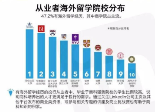 这是一份领英的报告,节选了里面的从业者海外留学院校分布数据。