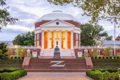 弗吉尼亚大学(简称UVA)创建于1819年,坐落在弗吉尼亚州中部的“夏镇”夏洛茨维尔,距离首府华盛顿D.C.仅100英里。