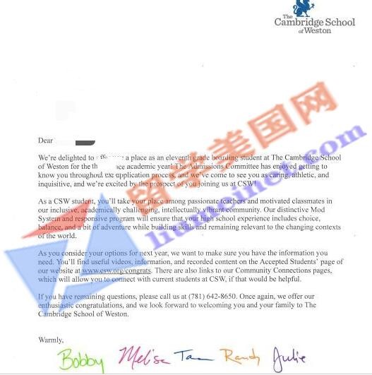 我们团队的老师不负孩子的期望,积极联络各大优秀美高的招生官,争取名额和面试机会,同时帮助H同学优化申请材料,撰写优质文书,进行面试培训,最终成功斩获威斯顿剑桥中学The Cambridge School of Weston的录取offer。