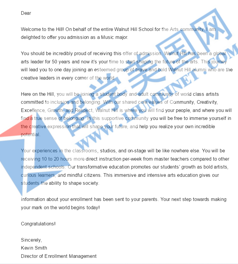 再次祝贺X同学喜获胡桃山艺术中学的录取offer!预祝X同学在胡桃山的学习生活中收获更多的精彩和成长,成就更加美好的未来!