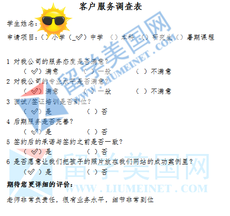 “机构认真负责专业,非常用心的去了解孩子成绩,性格和爱好,为孩子量身定制个性化的计划,并介绍和引导与之匹配的学校,我们家长非常满意,感谢留学美国网,感谢机构内各位老师一直以来的用心陪伴。祝愿留学网越办越好,使得更多的家长和孩子申请到最适合的学校。谢谢!我们非常满意留美网的服务,希望有更多的孩子与家长了解到你们。”