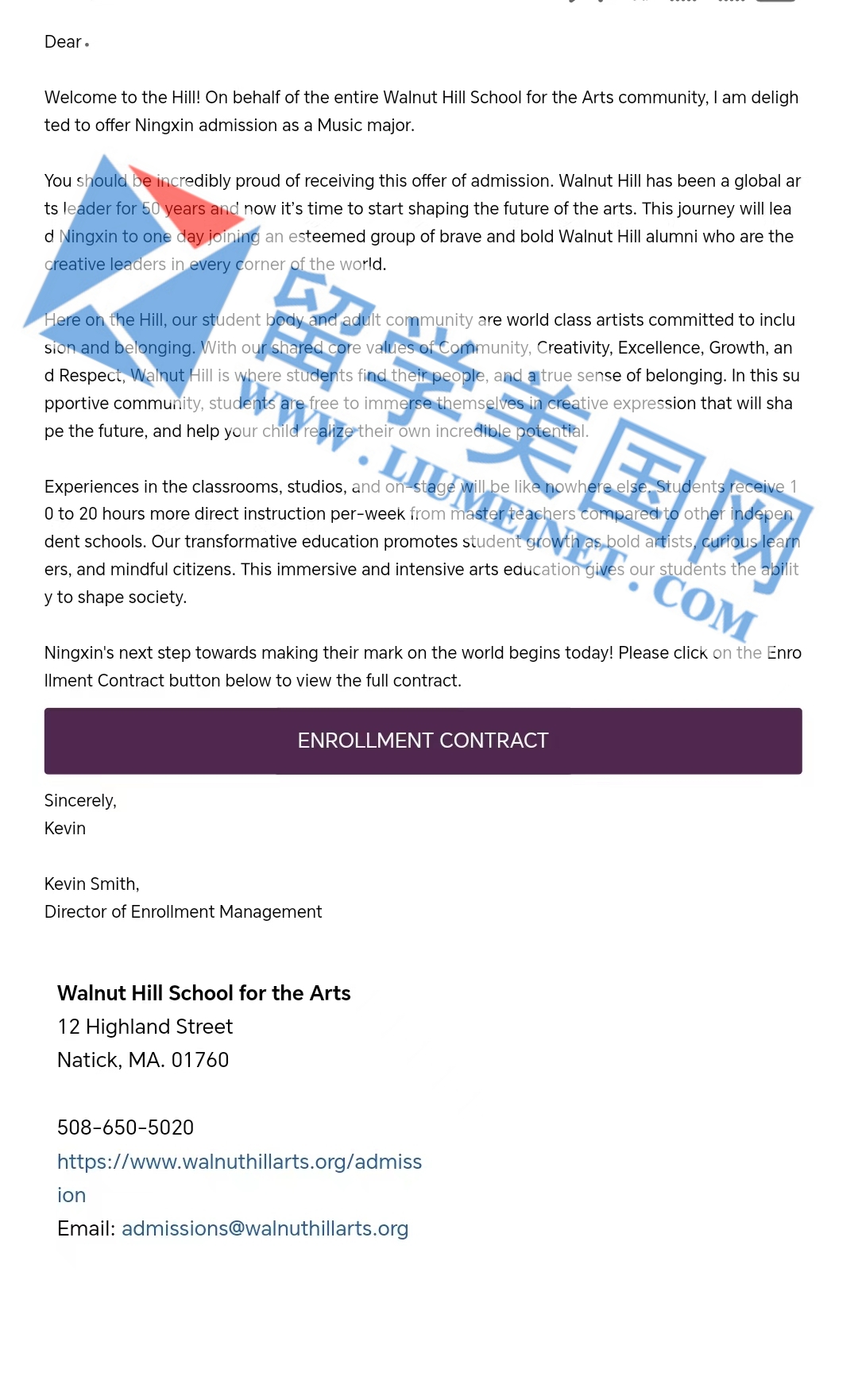 恭喜留美网学子L同学成功斩获胡桃山艺术高中Walnut Hill School for the Arts录取offer!