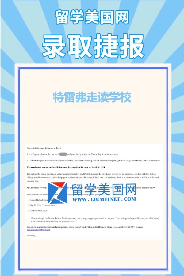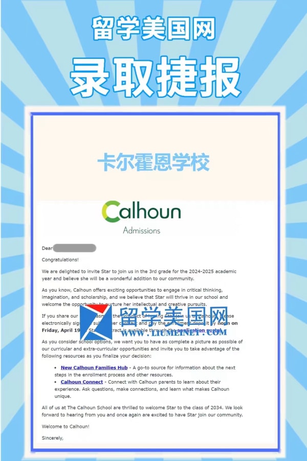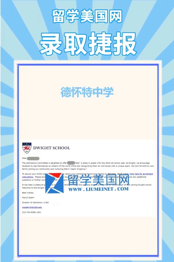 今日战报超燃!迈润肯24fall又双叒叕迎来喜讯!小S同学“三申三中”,斩获卡尔霍恩学校(The Calhoun School)、特雷弗走读学校(Trevor Day School)、德怀特中学(Dwight School)三枚录取!让我们再次恭喜小S同学成为“申校”赢家!