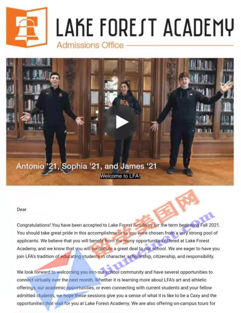 Lake Forest Academy湖森中学成立于1857年,位于芝加哥北部30英里的国家历史纪念地,校园被森林覆盖,占地150英亩。是一所独立的混合寄宿和走读学校,为9至12年级的学生提供大学预备课程。学校通过小班教学(平均12名学生)和师生之间的密切联系,提供了一种亲密而具有挑战性的教育环境。参加体育运动、俱乐部、艺术和领导机会有助于培养性格和自信心。