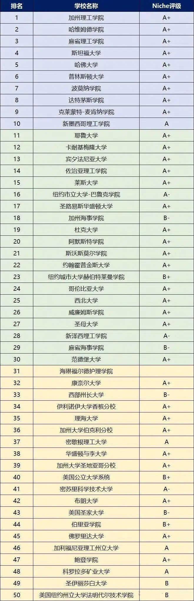 都知道读美本学费高昂,但对于中产教育投资来说更重要的考量是"值不值":孩子辛苦匹配到的教育资源能够提供足够的就业竞争力,而不是毕业后进入社会面对的是面试机会、工作Offer通通"打水漂"的残酷局面。 "花最少的钱,读最赚的大学"——性价比在当下无疑是广大美本家庭的关注重心。如果你QS、USNews榜单都翻烂了,那么不要错过作为美国院校"大众点评"的Niche网站。 它根据美国教育部的数据和数百万条评论,延续净价、校友收入、毕业率、学生债务四大核心指标,更新增经济流动性指数(衡量低收入学生毕业后收入跃迁能力),最新发布了—— 2026美国性价比最高的50所大学 相信这份榜单能给更关注一所学校毕业生就业情况、投资回报、就读性价比等信息的家庭一个全新视角的选校参考。 先划个排名重点 公立常春藤仍是性价比天花板 STEM强校"低投入高回报"属性拉满 经济流动性指数让"逆袭校"异军突起 一、性价比最高的前10所大学 1、加州理工学院 2、哈维穆德学院 3、麻省理工学院 4、斯坦福大学 5、哈佛大学 6、普林斯顿大学 7、波莫纳学院 8、达特茅斯学院 9、克莱蒙特麦肯纳学院 10、新墨西哥理工学院 在最具性价比大学的前十中,藤校&顶尖私立名校的光环依旧突出,而且有3所优秀文理学院也惊喜出现,分庭抗礼。 占据榜单第一的是理工神校加州理工学院,看看它在美国大学里有多神: 4个排名第一:性价比最高、最佳小型学院、最好的物理学大学、最难考的大学 多个排名前十:最好的工程学院第2、最好的化学大学第3、最好的计算机科学学院第4、最好的数学学院第6、接受通用申请最佳大学第8 哈维穆德学院位列US.News全美文理学院第10名,高居第二,而它也是去年Niche最具性价比大学排名的NO.1,打败了哈耶普斯麻与一众藤校,可见其综合实力的强劲且稳定。 顶尖私立名校霸榜 MIT、斯坦福、哈佛一同站位Top5,普林斯顿紧随其后排在第6;达特茅斯则是表现最佳的藤校,排名第8。 除以上,和去年一样继续跻身前10的两所顶尖文理校是波莫纳学院(#7)与克莱蒙特麦肯纳学院(#9),不输藤校。 值得一提的是,前10中大家比较陌生的NMT新墨西哥理工学院(西部),它在此榜单中可以说是"别人家争气的孩子",去年也在榜单中排名18,今年杀出重围,跃升至第10。 NMT是一所主打理工科的公立研究型大学,拥有众多特色研究中心,涉及水文、天体物理学、爆炸物工程、大气物理学等多个前沿领域。 2026年US.News排名情况: 位列西部地区区域性大学第20名(并列) 在该区域的顶尖公立学校中排名第10名(并列) 同时还位居最佳价值学校第35名 NMT规模小巧且性价比高,2024秋季该校本科生人数仅1085人,州内学生学费及费用为10112美元,州外学生为31683美元,结合其教学与科研水平,被评为当地极具性价比的院校之一。 毕业生的就业和深造表现也很亮眼,毕业后五年的薪资中位数达到83,712美元,95%的学生对毕业后找到本专业相关的工作充满信心。 公、私立校性价比大比拼,17:24,黑马+特色校5星好评 二、私立校:24所上榜,占据半壁江山 首先,纵览整个榜单后可以直观看到一些耳熟能详的私立名校稳稳的很安心:24所私立校上榜最具性价比大学Top50,占据一半江山;其中耶鲁、卡梅、宾夕法尼亚、莱斯、圣路易斯华盛顿、杜克、JHU、哥大、西北、圣母、范德堡等均榜上有名,且都排名前30。 还有几所上榜的特别私立校,它们是美国高等教育多样化和丰富性的最佳范式: 海伦富尔德护理学院(专注于护理教育) 西部州长大学(非营利性质的在线大学,提供灵活、可负担的高质量教育) 利哈伊大学(美国最佳设计类大学第20名) 圣家大学(私立天主教大学) 圣伊丽莎白大学(专注于天主教自由艺术教育) 公立校:17所上榜,黑马频出 其次,公立校方面的整体表现可圈可点,上榜17所;其中不乏一些综排名不见经传,但投资回报十分喜人的黑马校: 纽约市立大学巴鲁克学院(北部第11) 雷曼学院-纽约市立大学(隶属于纽约市立大学系统CUNY) 新泽西理工学院(综排第80) 密歇根理工大学(综排第148) 密苏里科技大学(美国顶尖的工程和STEM学科大学之一,在密苏里州内公立大学中工程专业排名第一) 科罗拉多矿业大学(综排第80) 它们或是理工科强势院校,或就业享有州内资源惠利,性价比非常不错。 而我们更为熟知的4所高性价比公立名校——佐治亚理工、伊利诺伊香槟UIUC、加州伯克利UCB、加州圣地亚哥UCSD、佛罗里达大学也稳稳上榜。 当然有一说一,公立校的因为需要照顾本州学生,在录取上难免有水平差异,但其更实惠的学费适合预算较低、学生自律的家庭,只不过需要注意考虑到班级规模大、资源分配卷的小缺点。 文理学院:9所上榜,小而精的代表 最后,文理学院在最具性价比大学榜单中也存在感十足,共有9所上榜。 除了前十的3所,还有阿默斯特学院、斯沃斯莫尔学院、威廉姆斯学院、华盛顿与李大学、贝里亚学院、鲍登学院。 大众认知中美国文理学院有个"阳春白雪不接地气"的标签,但其实文理学院在美国高等教育体系中是"小而精 + 高回报"的代表: 很多文理学院的基础学科,包括化学、生物、物理等在内的理科实力相当能打,而且文理学院主打小班教育,教授几乎都是亲自教学,课堂体验远胜大U,是藤校读研的热门输送站。 工科强校哈维穆德、斯沃斯莫尔、史密斯,STEM资源强,值得选;华盛顿与李、科尔盖特、里士满