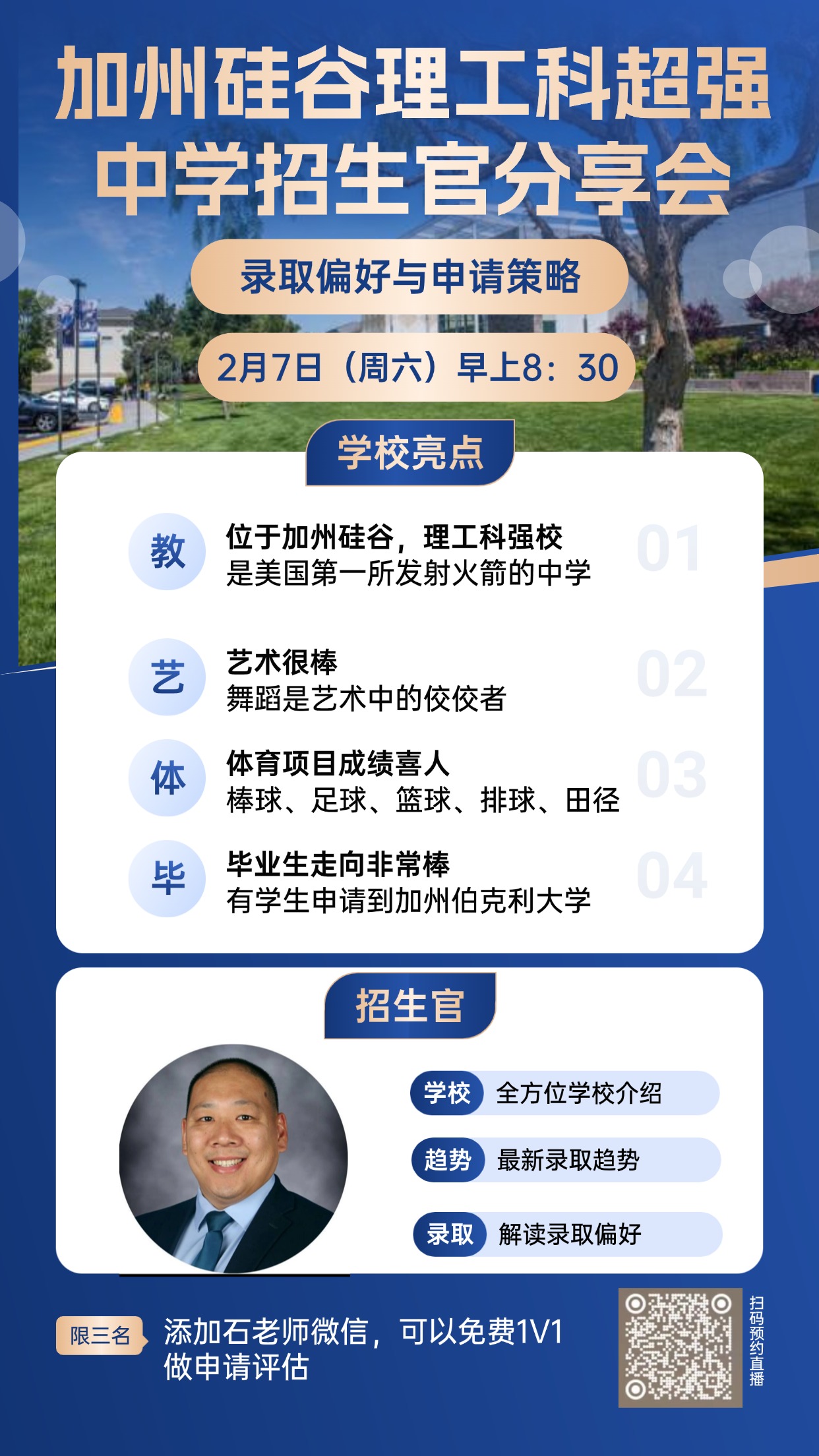直播亮点抢先看 全方位学校揭秘:招生官亲自介绍学校特色、课程设置、校园文化 录取偏好大公开:亲述学校青睐什么样的学生,避开申请雷区 2026年最新录取趋势与录取偏好变化 Q&A实时互动:现场解答家长最关心的申请问题 学生真实就读反馈 直播信息 时间:2026年2月7日(周六早上8:30) 主讲人:石老师、山谷基督高中招生官 预约福利 直播中可向招生官直接提问 石老师将在直播间提供免费1v1申请方案定制名额(数量有限,先到先得) 山谷基督高中: 这所学校石老师亲自走访过,也有学生就读。这所学校是硅谷地区最好的高中之一,学校的学术、课程设置和活动都是非常不错的。高中教师57%being experts in their fields and ho1ding master’s degrees。在山谷基督圣何塞学校,学校的使命是营造培养环境、提供强有力的基础素质教育、强调基督教价值观、与家长共同合作,让学生成为领导人、积极为上帝、为家庭为社区和世界服务。石老师评价这是一所让人很震惊的学校 。 学校亮点: 【地理位置】 山谷基督学校 Valley Christian School 位于美国加州圣何塞 (San Jose) 硅谷的中心地带,多次获得全美最高荣誉—蓝带学校称号,是加州乃至全美顶尖私立学校。 【学校设施】 学校建于1956年,占地40英亩,坐落于极佳的山景边,同时游泳池、棒球场、健身房、艺术楼等应有尽有,同时该校是全美第一个拥有国际航天站的中学,建有天文台。该校曾获布什和奥巴马总统的嘉奖和认可。 【学术强项】 拥有很强的Stem课程和机器人项目。 【艺术项目】 拥有一流的视觉艺术项目,绘画,素描,摄影和雕刻,其中摄影课最为著名。 【体育竞技】 为丰富学生课外活动,学校特地安排学生户外野营,所修科目可以抵减体育课学分,平常课外活动体育项目包括:篮球、棒球、田径、美式足球、体操、高尔夫、英式足球、垒球、游泳和跳水、网球、排球、越野以及拉拉队,学校有合唱团和乐队。 【课外活动】 从新生辅导开始,共有80多个学生俱乐部、精神集会等。VCHS通过有趣的活动让学生参与校园生活,如返校节精神周、舞会、盛装打扮日、俱乐部博览会、圣诞精神周、周五“Fun-at-lunch”和一年一度的班级比赛“Warriors Warz”等。 【特色项目】 1.学校有很强的Stem课程和机器人项目,定时谷歌和硅谷的科技人才会来学校进行指导。 2.这所学校是美国第一所从国际空间站发射火箭的中学,在国际空间站做的项目比美国航空航天局还多。 毕业走向: 哈佛大学、耶鲁大学、斯坦福大学、普林斯顿大学、宾西法尼亚大学、哥伦比亚大学、芝加哥大学、约翰霍普金斯大学、麻省理工学院、达特茅斯学院、波士顿大学、布朗大学、杜克大学、康奈尔大学、西北大学、东北大学、圣母大学、乔治城大学、南加州大学、纽约大学、布兰迪斯大学、卡耐基梅隆大学、凯斯西储大学、佐治亚理工学院、加州大学洛杉矶分校、加州大学伯克利分校、华盛顿圣路易斯大学、加州大学尔湾分校、加州大学圣地亚哥分校、伦斯勒理工学院、莱斯大学、北卡教堂山分校、伊利诺伊州香槟分校、威斯康辛麦迪逊分校、维拉诺瓦大学等。 留美网24小时热线:15011066813.png)