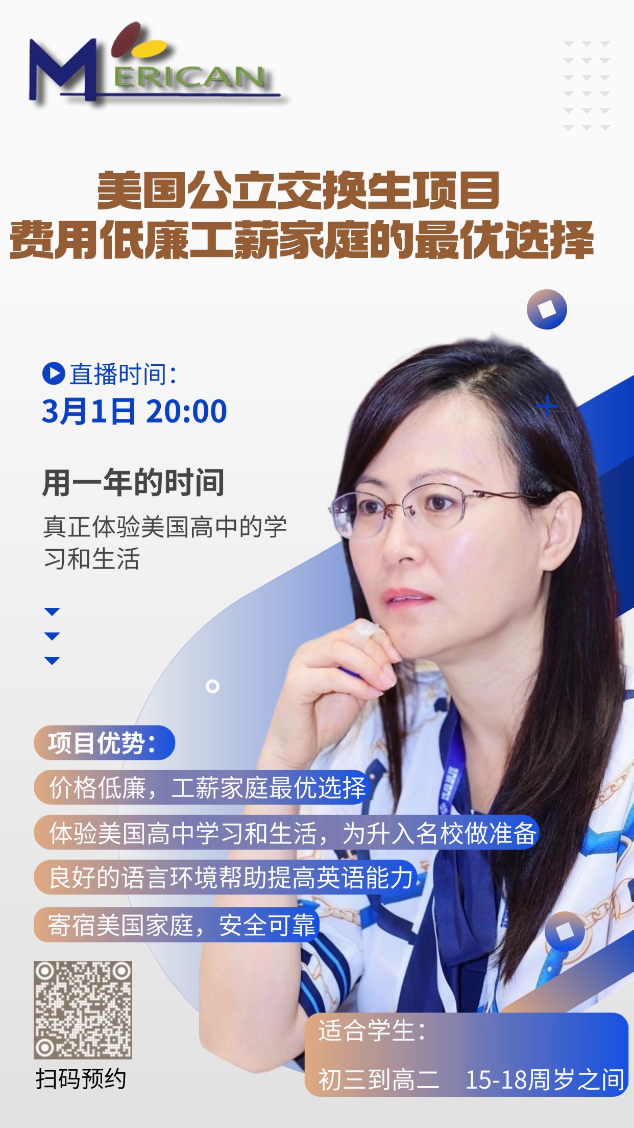 我们主要是针对于想要体验美国本土的文化又相对来讲费用比较合理,它主要针对的群体是15-18周岁之间,主要是初二到高二之间。要求英语成绩也是不错的,因为他要能听懂课,学习还不错的。超高性价比。