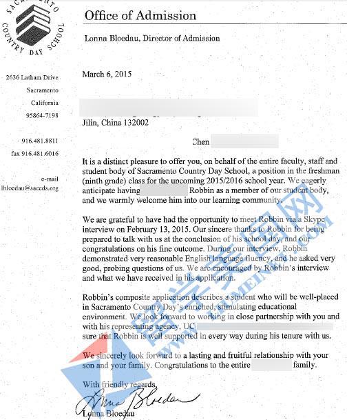 上图为留美网学生OFFER。里根总统儿子曾就读该校。