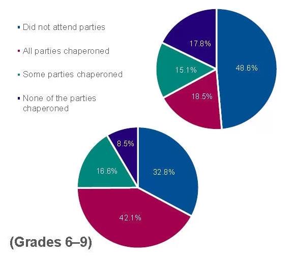在此项调查中,家长对学生的干涉比例都偏高。63.6%的高年级学生和80.4%的低年级在家长的高密度干涉之下,低年级学生的比例相对更高。 这一点可以从学生参与派对的情况中看出来:有42.1%的低年级学生父母会陪同孩子参加所有派对,仅有8.5%的父母不参与其中;而高年级学生中,不陪同子女参加派对的比例有17.8%。但值得大家关注的是,低年级居然比高年级学生更爱参加派对,仅有32.8%的学生不参加任何派对。当然,这一点可能与9-12年级学生升学压力有关,美国学生也是要学习的呢,千万不要误会他们“夜夜派对”!