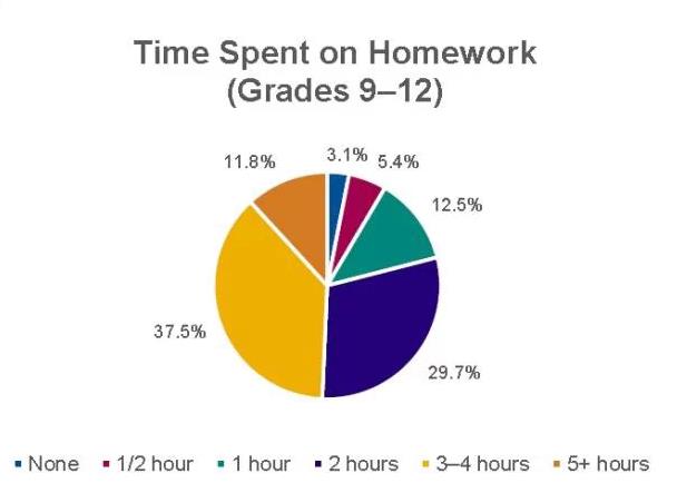 在这张图表中我们看出,9-12年级学生中,在回家作业中花费3个小时以上的比例几乎占到了一半,可见美高学习也并不轻松,抱着读不了国内高中就去国外心态的学生和家长们,可要好好考虑下了。