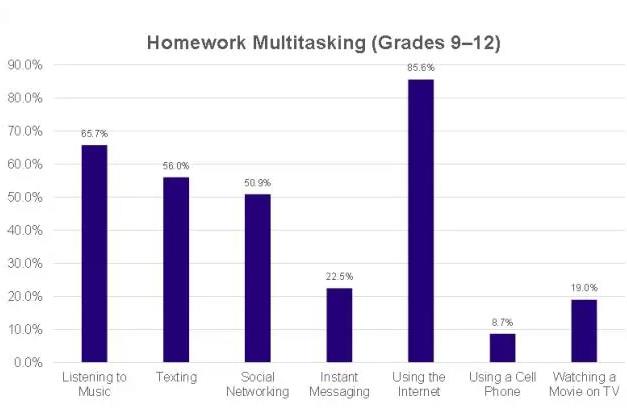 其他作业任务方面,相比中国高中较多的paper work不同,美高学生们排名靠前的作业项目还有听音乐、社交网络作业、看电视等,文字作业仅以56%排名作业项目第三。并且,由于社交网络的作业比例达到了50.9%,所以在9-12年级的学生中,有92.1%拥有至少一个社交网络账号,而6-9年级的学生也达到76.8%的比例。