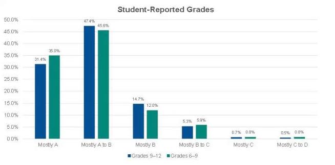 学生压力大,作弊行为达21.1% 在这项报告中有很多需要学生自己回答的问题,其中就包括是否曾经作弊。在这个项目的调查中,9-12年级学生有21.1%称自己曾经作弊,这个比例在6-9年级学生中是12.8%。 一位美高妈妈聊过这方面问题,她曾告诉我:在美国被发现作弊是非常严重的行为,很可能会被退学,她就认识一位因作弊被退学的男孩。但即便作弊行为后果如此严重,学生作弊的比例依然不低。 那么,作弊行为是否和学生的学业压力或是课程难度有关系?在NAIS的调查中显示,9-12年级的学生中,有60.5%感到非常大的压力,有28.3%学生则称感受到“extreme pressure”(极端的压力),由此可见,大部分美高学生都处于高压情况下;高年级学生有升学压力可以理解,但即便是6-9年级学生感受到高压的比例也达到了85%。 在这种高压力的情况下,学生的成绩水平如何?接下来让我们看看美高学生的成绩。在图表中,接近一半的学生在A与B之间;约80%的学生成绩在B以上。