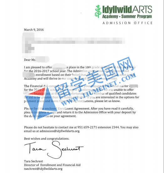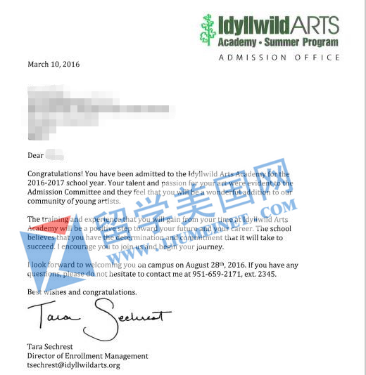 4、留美网张同学获得美国加州艾迪怀德艺术高中Idyllwild Arts Academy的offer