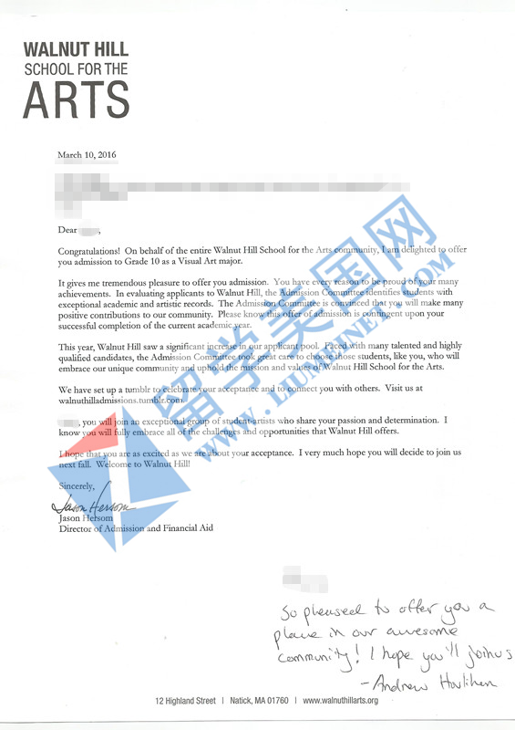 3、留美网张同学获得Walnut Hill School for the Arts胡桃山艺术高中的offer。