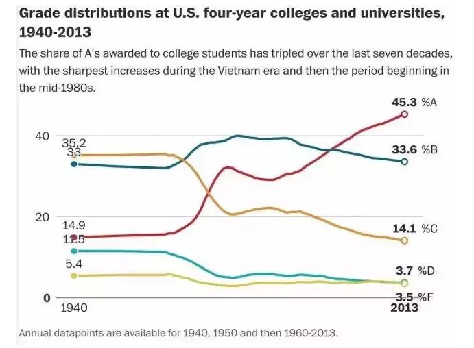从数据可以看出,从1960-2013年这70年来,美国获得A的学生比例增加3倍,从1940年的15%到2013年的45%,现在有近一半的学生成绩都在A以上。在私立学校,这种现象更明显。